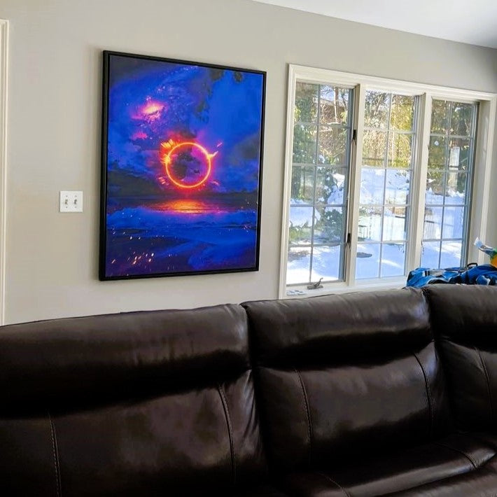It gives art the illusion of floating inside of a sleek premium black frame without touching it, which creates stunning visual detail and a sense of three-dimensional depth in the overall display.